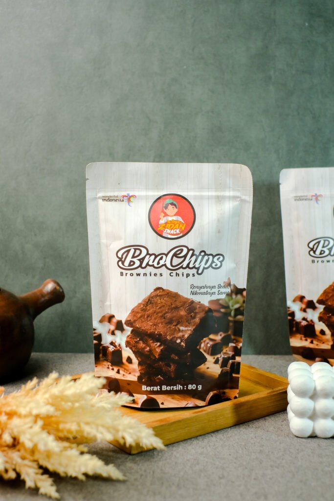 Brownies Chips Brochips adalah makanan olahan dari brownies dan coklat chips yang dipotong tipis lalu dikemas dalam standing pouch unik dan menarik. Brownies chips merupakan snack, inovasi dari brownies dan coklat chips yang ditipiskan, bisa dinikmati kapanpun dan dimanapun dengan masa penyimpanan lumayan lama hingga satu tahun tanpa adanya bahan pengawet, pewarna dan penguat rasa jadi aman dan nikmat untuk dikonsumsi.